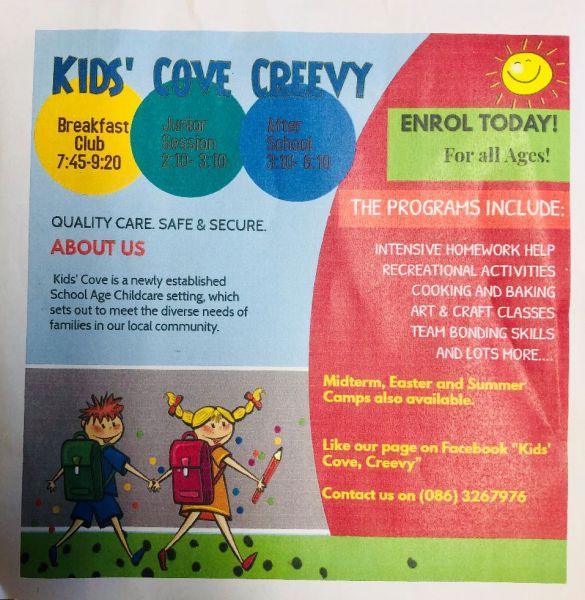 Kids' Cove Creevy offer a wonderful preschool breakfast club and an after-school homework club just across the road from the school. The pupils in Creevy love all the activities they have on offer each day and even better their fun camps during holiday periods. Look up their facebook page Kids' Cove Creevy for more information or call Amanda on 0863267976 to book your place.